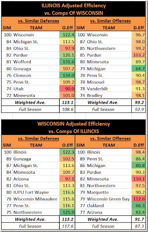 [NOTE: I actually treated HFA the same way Pomeroy does, but I didn’t want to make the equation look even messier]Finally, I took a weighted average of those efficiencies, with the weight being the similarity score. This gives me an adjusted defensive efficiency for Wisconsin that is specifically for games against offenses similar to Illinois.