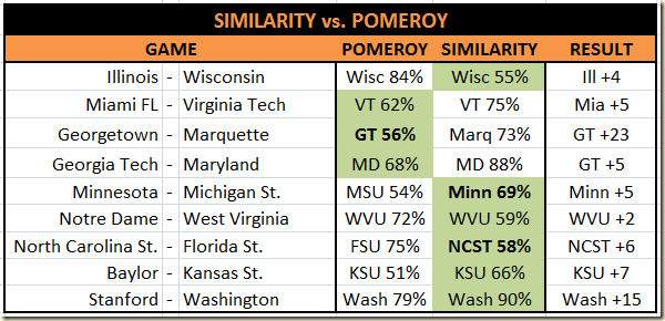 The similarity-derived numbers are way higher on Illinois than the standard Pomeroy ratings are. Now, the Badgers are still favored, it looks like nearly a tossup, instead of an easy win. For a lot of games, the two predictions are nearly identical, but there are other cases like Wisconsin-Illinois, where there are large differences. Here are the other major conference games from today where there was a sizable difference. Some have already taken place, and for those, I’ll note the result and whether the similarity-derived prediction seemed better or worse than the standard Pomeroy (I’ll update the rest tomorrow).