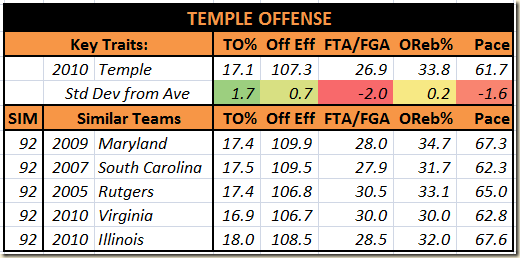 This is a fantastic group of comps – a national champion, and three other teams that performed well in the tourney. 2008 Texas A&M held eventual Final Four team UCLA under 1 point per possession in their season ending loss, as did 2009 Xavier against near-Final-Four team Pittsburgh. 2008 Wisconsin did well until they ran into the Stephen Curry buzz saw, and everyone knows how 2007 Florida turned out. I’ll be curious to see if Temple’s defense can match these prior performances.