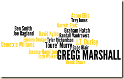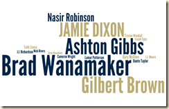 To remedy this problem, I thought it would be fun to (1) count how many times a player was name-dropped in various season previews, and (2) make a word cloud out of the results.  Accomplishing #1 was more difficult than I thought, at least if I wanted to do it for more than one or two teams.  So instead, I recorded the number of results found on Google News from October 17 to October 31, with a ton of assistance from Excel and URL Opener.  [I chose October 31 to avoid most exhibition game recaps, and October 17 because Google wouldn’t let me go back any further.  The player names I searched for were simply taken from ESPN.com’s team rosters.]  Then I massaged the numbers a bit (so that end of the bench players would actually be visible), popped them into Wordle, and voila.  Ladies and gentlemen, your Baylor Bears: